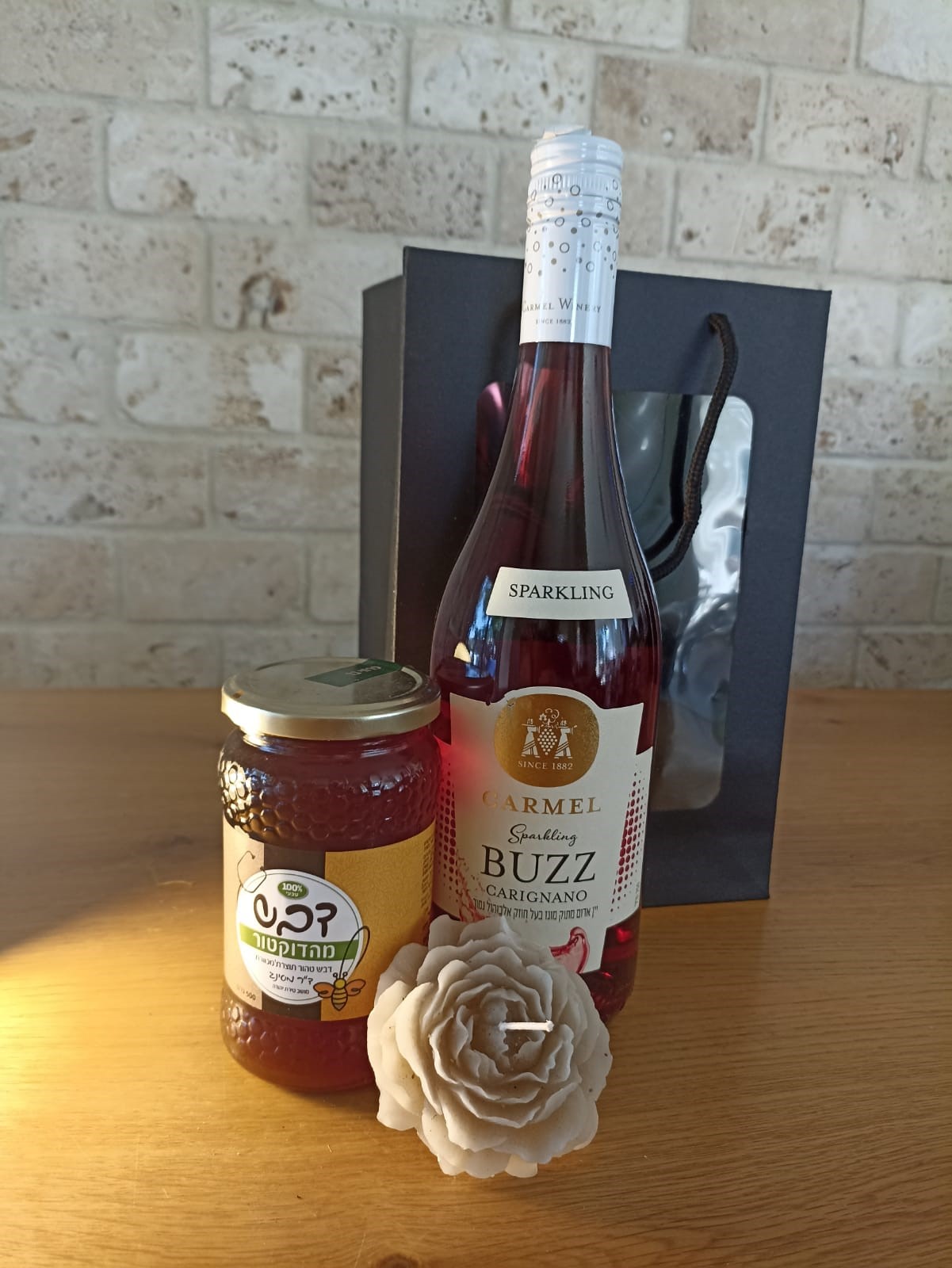 מארז צנצנת דבש 500 גר' עם בקבוק יין באזז ונר מעוצב מדונג דבורים טבעי, באריזת שקית קרטון מהודרת עם חלון