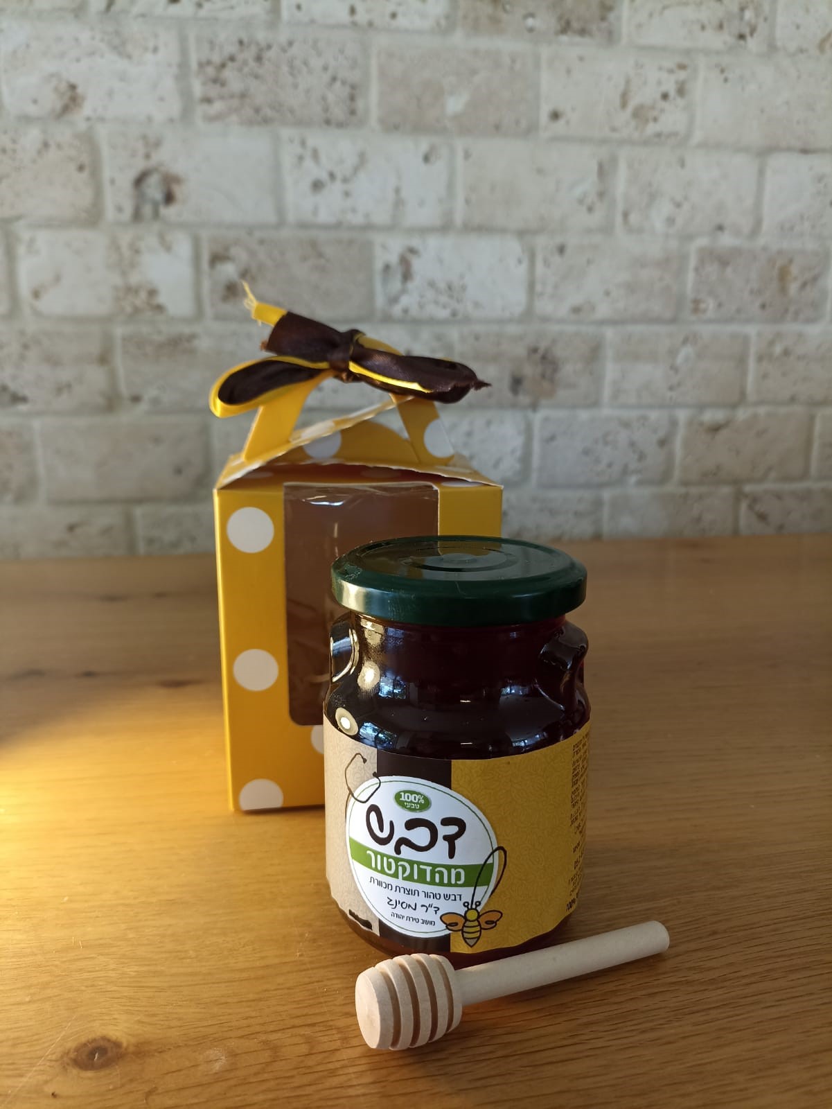 צנצנת דבש פרחי בר 385 גר' במארז קרטון צהוב מנוקד עם חלון